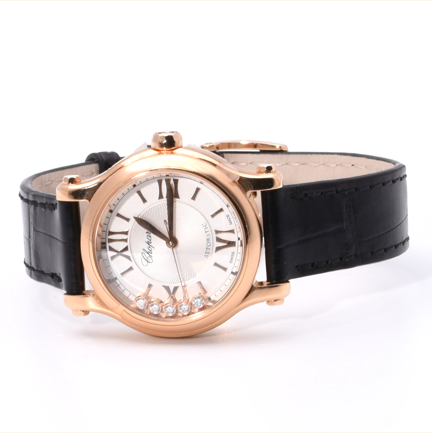 | Ziffernblatt: | 5 Brillanten zus. 0,14 ct. (Happy Diamonds), Silberfarben mit Guillochierung in der Mitte |